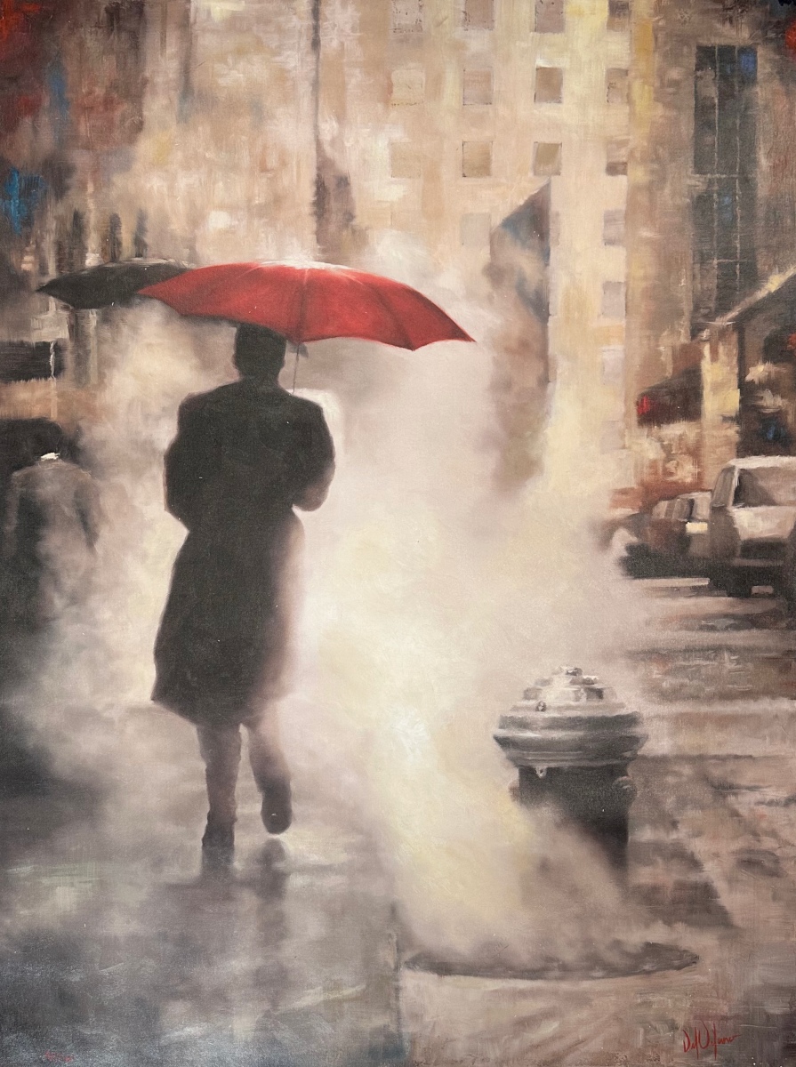 This piece depicts a mysterious figure walking through the city smoke on the way to his destination.